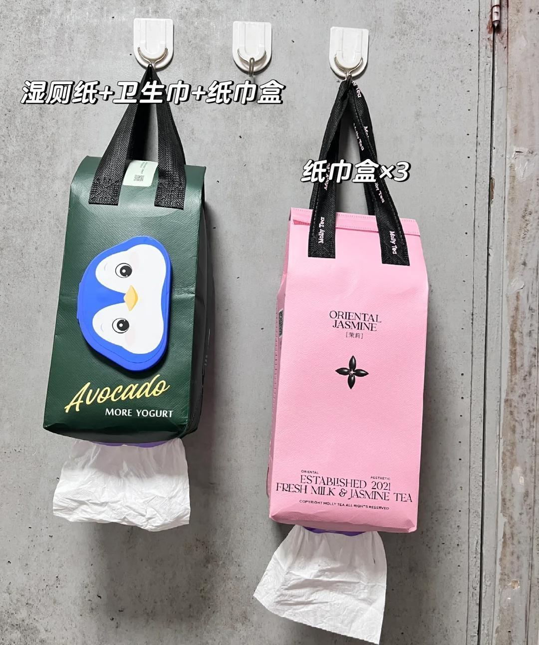 可以用外卖袋来收纳纸巾,是不是没有想到呢?外卖袋还可以防止卫生间中的水汽,真的超好用。
