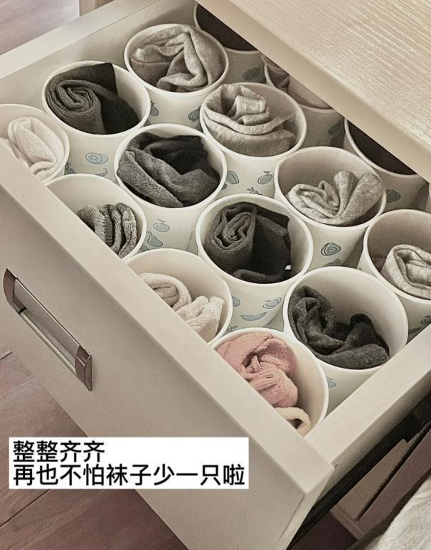 只需要把每次用剩下的卫生纸纸桶收集起来,再放到抽屉中,变成一个个独立的小空间,用来收纳袜子,真的超级香。
