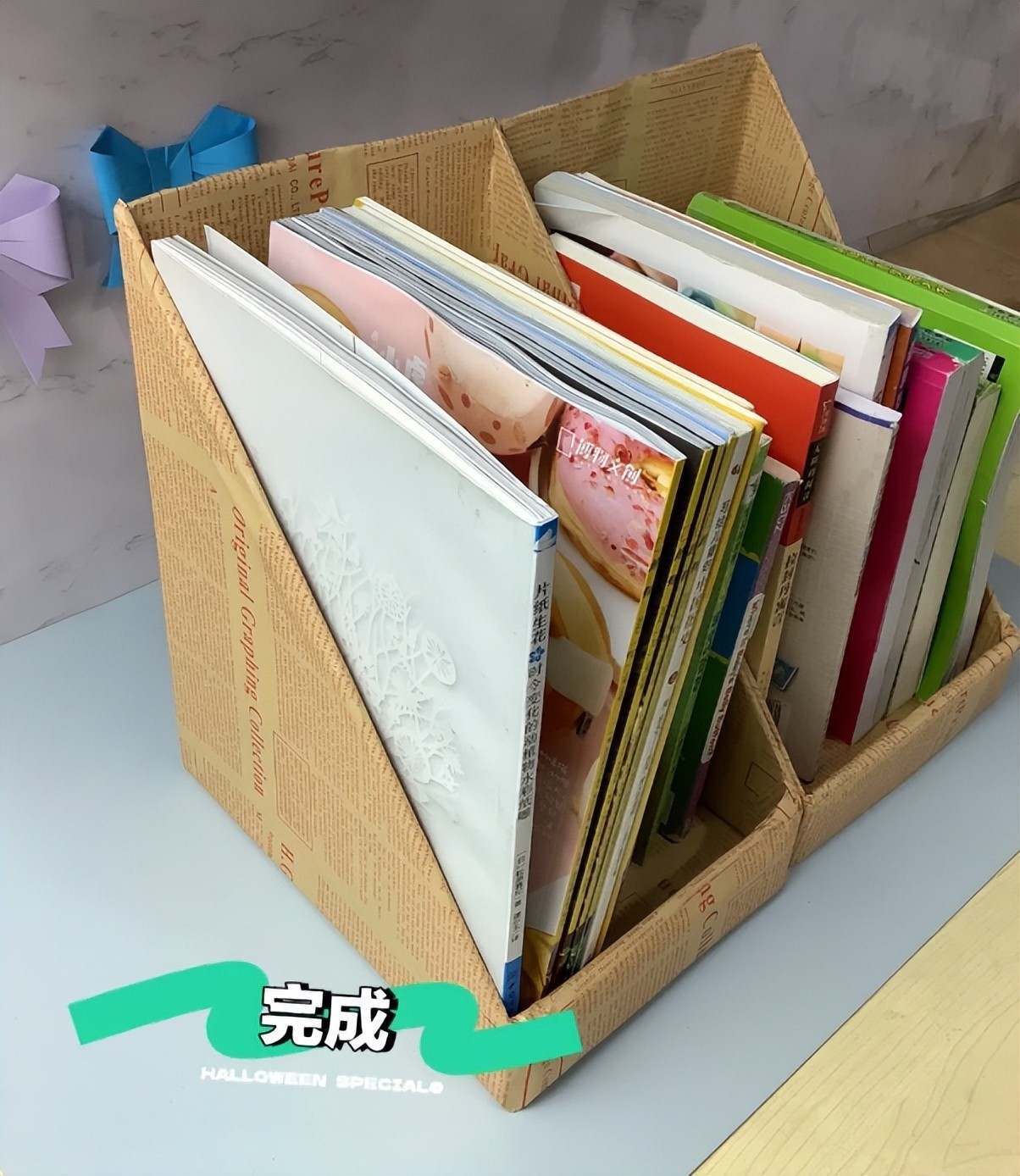 9. 纸箱收纳书本家中的纸箱也千万不要随意丢弃,简单的改造一下,也可以边做书立哦。
